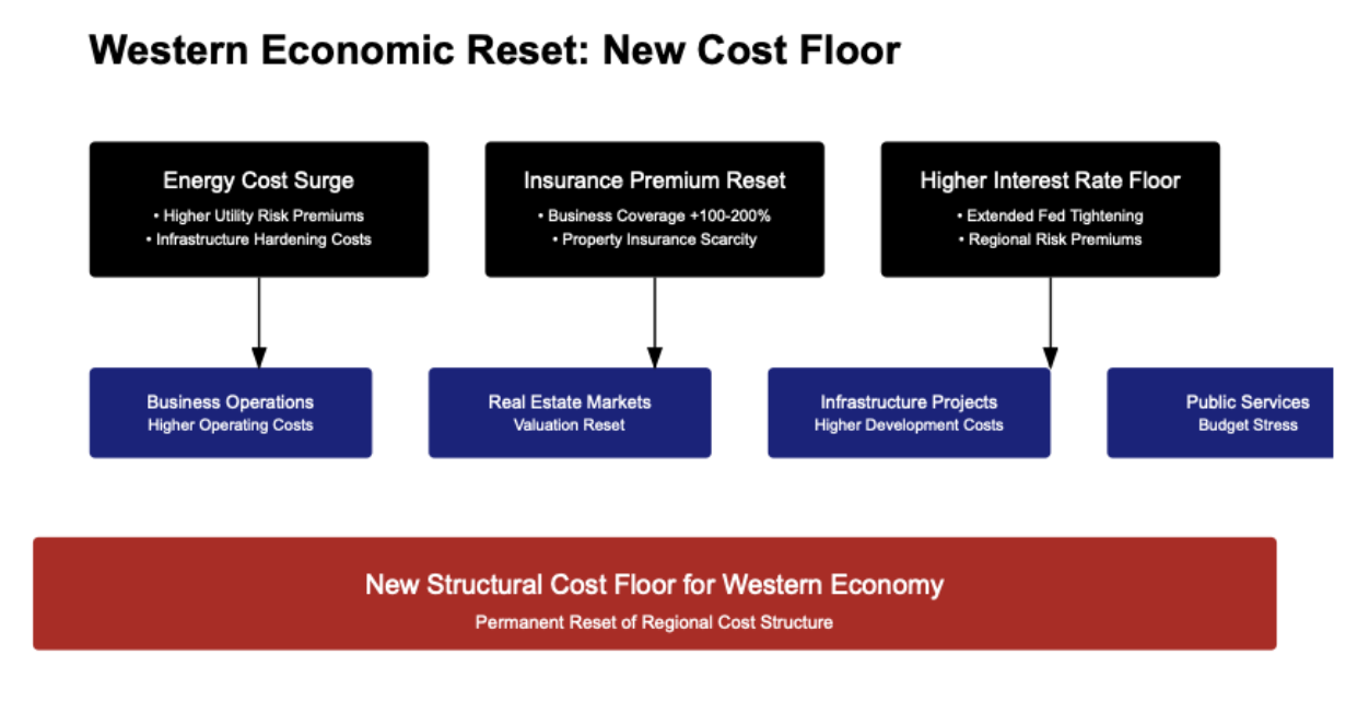 This convergence is creating amplifying feedback loops that traditional economic models struggle to capture. For example, as insurance costs rise, businesses face higher operating expenses, leading to increased prices and wages. This regional inflation pressure keeps interest rates elevated, which further stresses real estate markets and municipal finances.